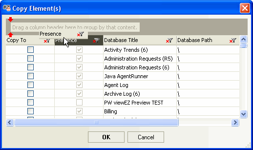 4) The Copy Elements dialog should be open. Now to quickly determine which databases have the selected ACL entry, simply drag the Presence column header to the ‘grouping areas’ as shown the images below: