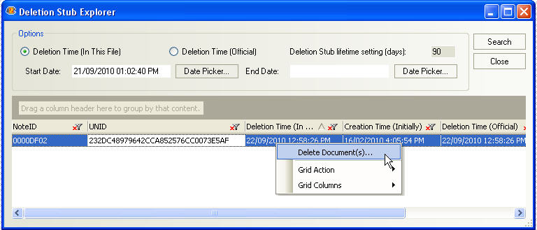 Deletion stubs, as you may know, contain no usable data, just a document’s UNID, Note ID, sequence number and sundry date information (i.e. Created (Initially); Modified (In this file); etc.), their only purpose is to tell other replicas to delete their copies of documents deleted elsewhere.