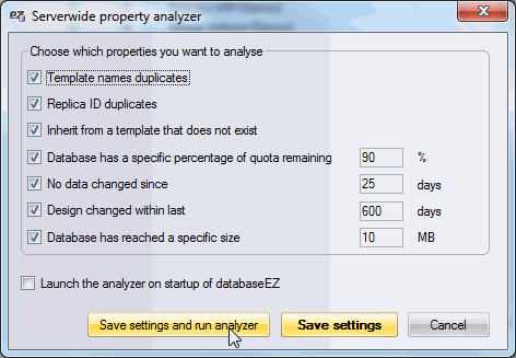 The Serverwide Property Analyzer tool in databaseEZ offers a novel way to find databases that have particular issues (e.g. multiple NSF files sharing the same Replica ID) or characteristics (e.g. their document data hasn’t changed within a given period). Please note that the settings for this dialog are ‘sticky’, so you can close and re-launch databaseEZ and run the same Property Analyzer scan.